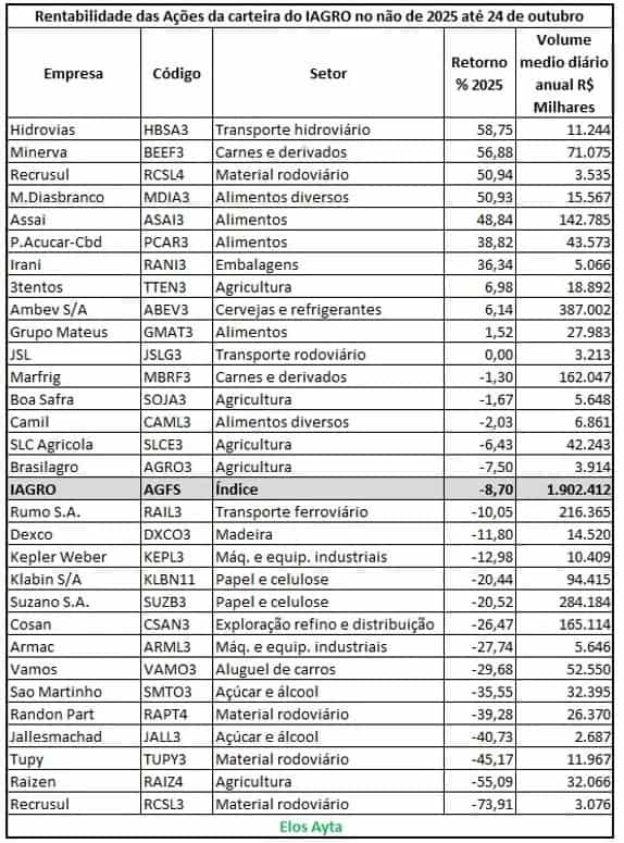 Entre os índices da B3 acompanhados até 24 de outubro de 2025, apenas três apresentam perdas no ano. O IAGRO, que mede o desempenho de ações do agro na bolsa, é o que mais recua, acumulando uma queda de 8,70% na janela em questão, segundo levantamento da Elos Ayta Consultoria.