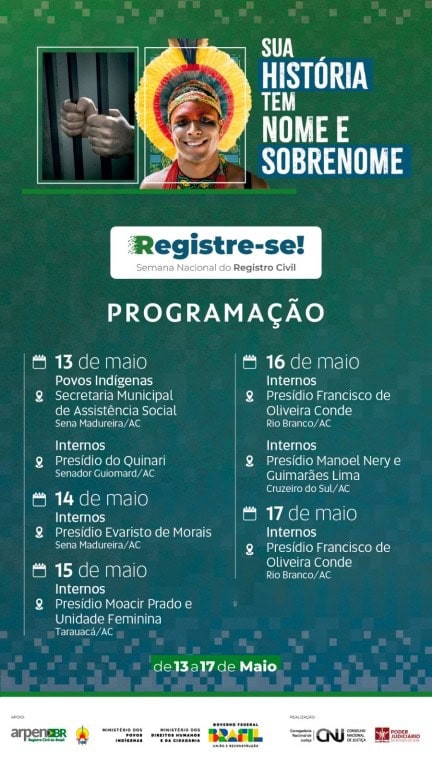 A 2ª edição da Semana Nacional de Registro Civil, “Registre-se”, do Conselho Nacional de Justiça (CNJ) atenderá indígenas e população encarcerada no Acre, entre os dias 13 a 17 maio, com emissão de documentos nas Unidades Penitenciárias do interior e capital.