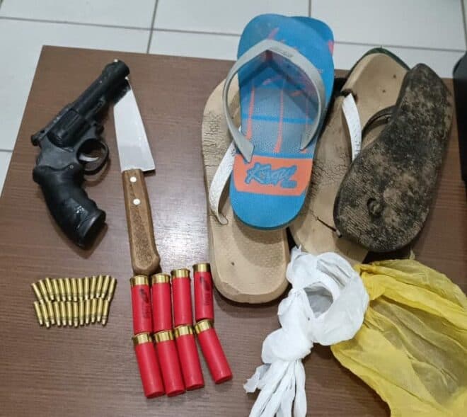 Quando chegaram no local, perceberam que três indivíduos saiam do mato e, ao avistar os agentes, saíram correndo. Ao darem a volta, alcançaram um dos suspeitos que foi detido e levou os policiais até onde supostamente teria armas e munições.