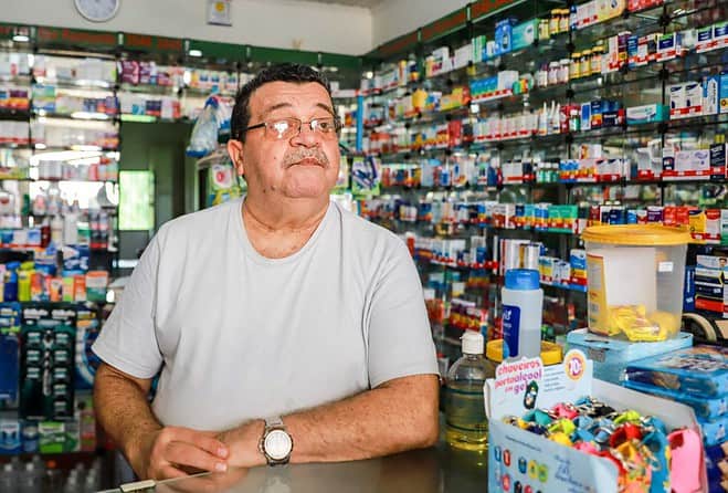 Licurgo Hassem acompanha há décadas, do balcão da sua drogaria, o centro de Brasileia. Foto: Marcos Vicentti/Secom