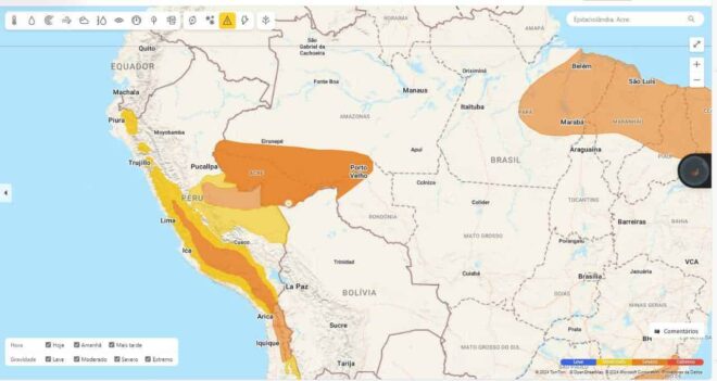 O Instituto Nacional de Meteorologia (INMET) emitiu um aviso importante para a população em seu site alertando sobre condições climáticas adversas cobrindo todo o estado do Acre, parte do Amazonas e Rondônia. De acordo com o aviso, são esperadas chuvas entre 30 e 60 mm/h ou 50 e 100 mm/dia, acompanhadas por ventos intensos atingindo velocidades de 60 a 100 km/h.