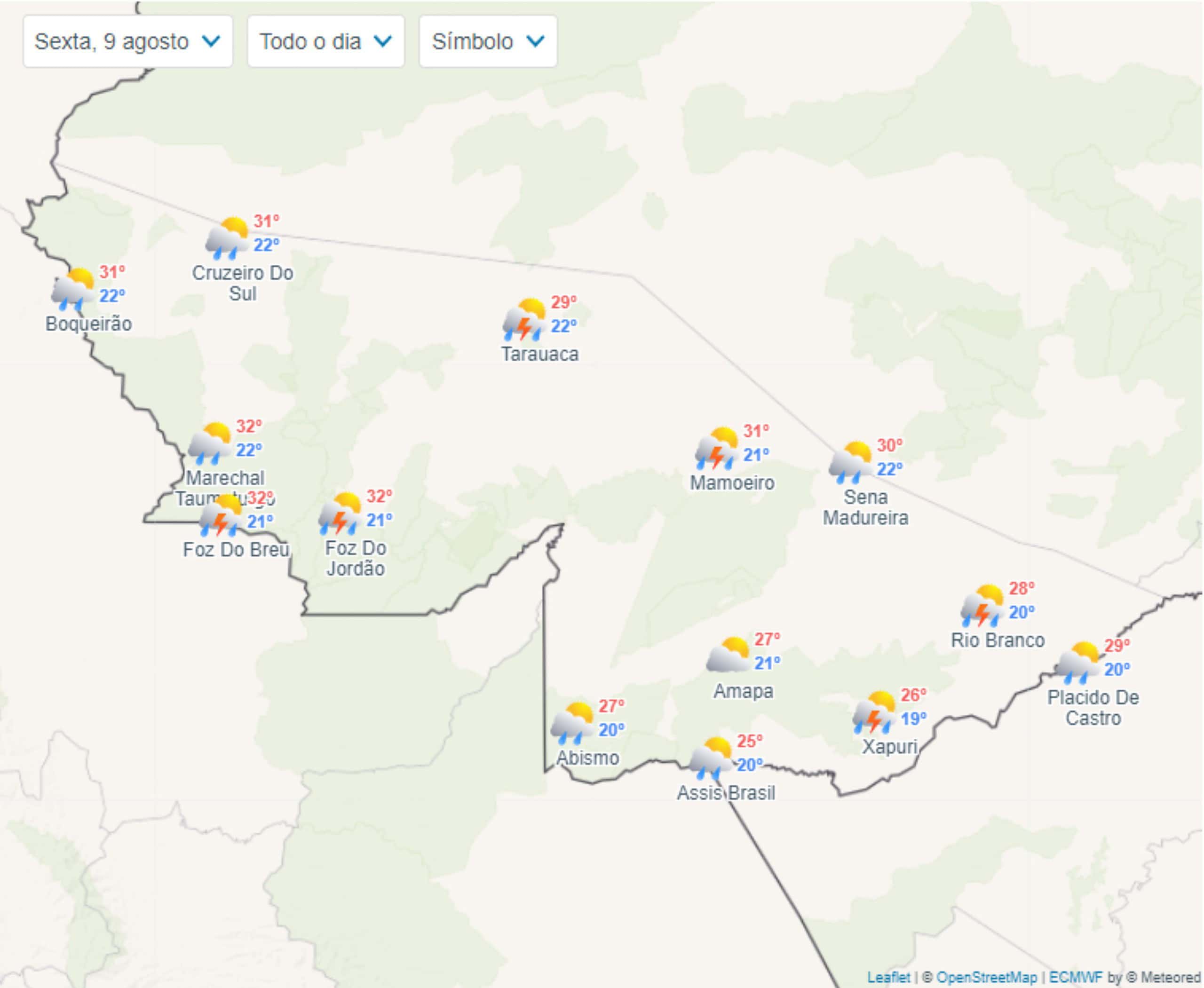 Neste final de semana, as condições meteorológicas em Brasiléia, Cruzeiro do Sul e Rio Branco, e em outras cidades do Acre, serão de temperaturas amenas e sem a ocorrência de frio intenso. De acordo com o Instituto Nacional de Meteorologia (INMET), a previsão indica um clima predominantemente quente e seco, com possibilidades de pancadas de chuva isoladas em algumas regiões do estado.