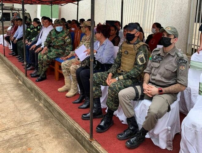 A Força Especial de Combate ao Narcotráfico da Bolívia – FELCN, inaugurou um escritório fixo na cidade de Cobija/Pando essa semana. O Acre marcou presença ao evento, na pessoa do Cel. PMAC Assis Martins dos Santos, coordenador do Grupo Especial de Operações de Fronteira (GEFRON), designado pelo Secretário Paulo Cézar Rocha dos Santos, para representar a Secretaria de Justiça e Segurança Pública (SEJUSP).