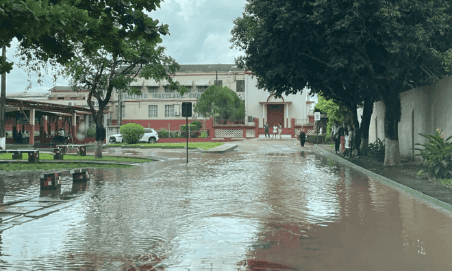 Imagem enviada ao ac24horas nesta quinta-feira, 29, mostra que a alagação já toma conta de boa parte do pátio da tradicional instituição de ensino.