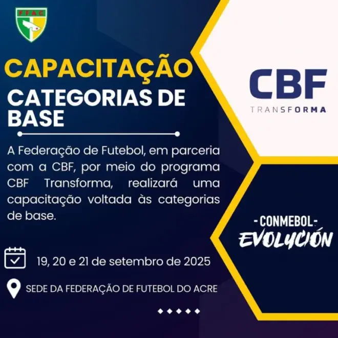 A Federação de Futebol do Acre (FFAC), em parceria com a Confederação Brasileira de Futebol (CBF), está promovendo desde sexta-feira (19) uma capacitação voltada para profissionais que atuam nas categorias de base. A atividade, que encerra neste domingo (21), ocorre na sede da FFAC, anexa ao Estádio Tonicão, em Rio Branco, e integra o programa CBF Transforma.