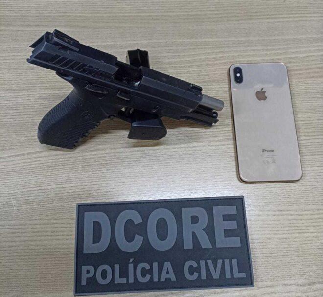 A pistola calibre 380 e o aparelho celular foram localizados no início da tarde desta quarta-feira, 22.