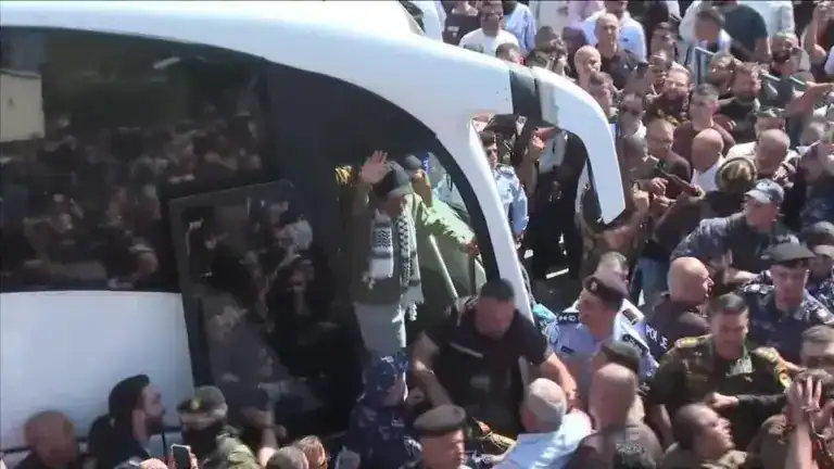 Alguns dos ex-prisioneiros foram vistos posando nas janelas dos ônibus, exibindo cartazes “V de Vitória”. Eles passarão por exames médicos nas instalações hospitalares.