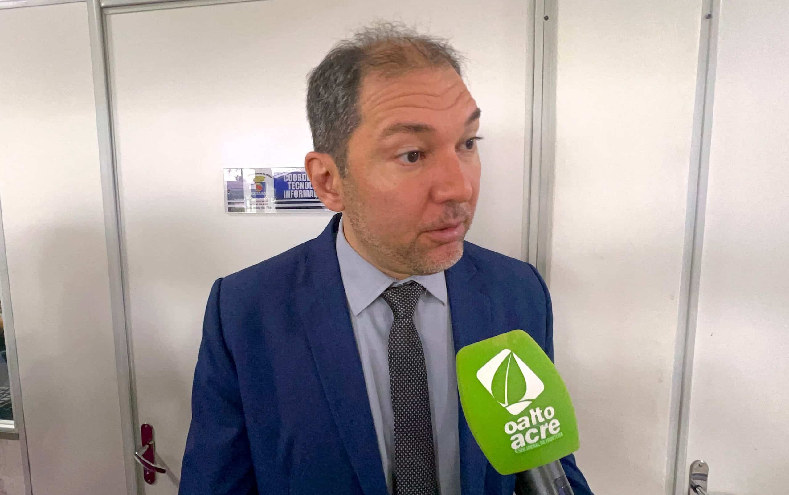 Em coletiva de imprensa, o delegado Gustavo Neves destaca que a Operação Desmonte 4 representa mais um duro golpe contra o crime organizado no Acre. Foto: assessoria/ PCAC
