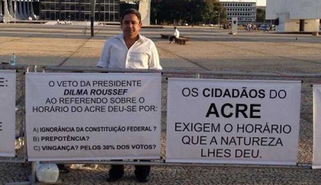 Ainda de acordo com Neto, o ex-deputado espalhou cartazes que chamam a atenção dos transeuntes pela crítica ao que chama de “forças maléficas e clandestinas que traíram a confiança do povo acreano”. “O ex-deputado tem a companhia de um sobrinho e utiliza um banheiro público razoavelmente longe. O ex-parlamentar diz não estar ali como político, tampouco movido por corporativismos, e sim como cidadão, mas também levanta suspeitas de que o veto seja uma represália de Dilma à pífia votação obtida por ela nas última eleições no Acre”, completa o jornalista, lembrando que Correia já fez greve de fome, em Rio Branco, por 75 dias, após a Justiça Eleitoral rejeitar o seu pedido de uma perícia na fita de gravação do programa da TV – 5, retransmissora da Rede Bandeirantes no Acre, que registrou a briga entre o entrevistado e o jornalista Demóstenes Nascimento.