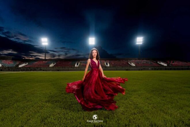 Um local inusitado para o início das comemorações de um aniversário de 15 anos, mas não para uma menina/mulher apaixonada por futebol. Marcela Cristine, 15, escolheu a Arena da Floresta para um ensaio fotográfico. A garota atua nas equipes do Colégio Dom Pedro II no futsal e no futebol de campo e quer ser uma atleta profissional.