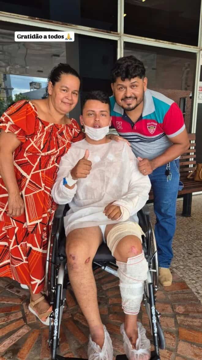 Na noite desta sexta-feira (22), ele publicou uma foto em suas redes sociais ao lado da família, sentado em uma cadeira de rodas no pátio do hospital, ainda com ferimentos visíveis, mas fazendo o sinal de positivo com o polegar. A legenda resumia seu estado de espírito: “Gratidão a todos”.