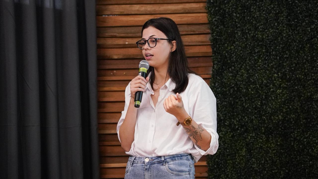 Consultora da Unesco, Larisse Cruz, conduziu uma apresentação sobre a incorporação do gênero como eixo estratégico na política ambiental. Foto: Samuel Moura/Sema