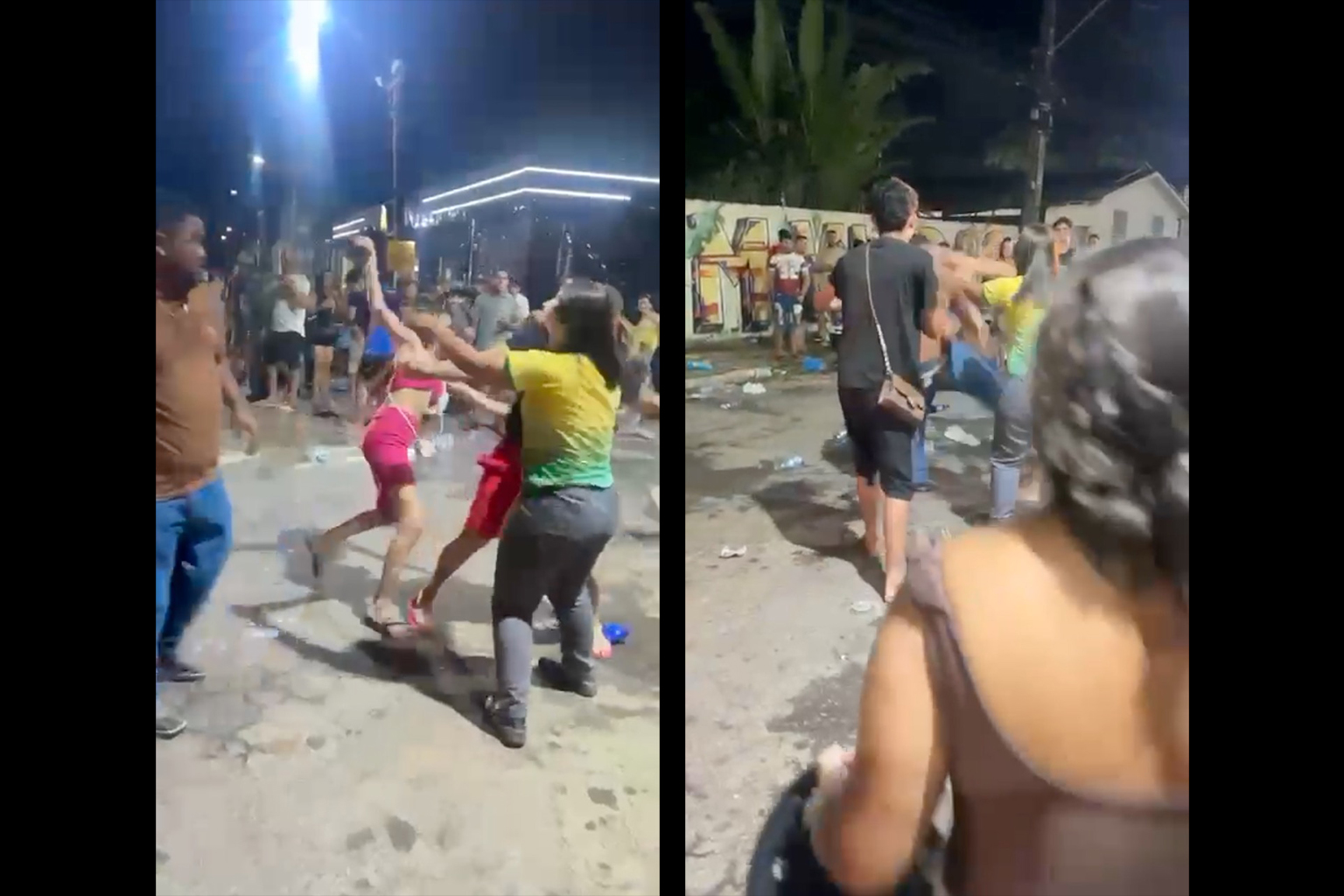 Na sequência, mulheres também entram na briga e, durante o tumulto, uma garrafa chega a ser quebrada contra um dos envolvidos. Apesar da violência da cena, a confusão foi contida após alguns instantes e, aparentemente, não houve registro de feridos no local.