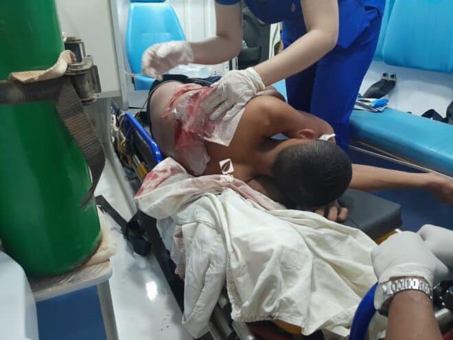 Familiares encontraram Sebastião ensanguentado e acionaram a Polícia Militar e o Serviço de Atendimento Móvel de Urgência (Samu). Ele foi socorrido e encaminhado ao Hospital Regional de Boca do Acre, onde seu quadro foi estabilizado. Devido à gravidade das lesões, a vítima foi transferida para o pronto-socorro de Rio Branco, onde permanece em estado estável.
