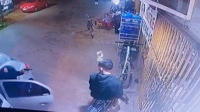 Imagens de câmeras de segurança mostram o momento em que a vítima, parada sobre uma bicicleta em frente a uma distribuidora onde teria ido comprar cigarros, é surpreendida por um veículo modelo Gol, de cor prata.