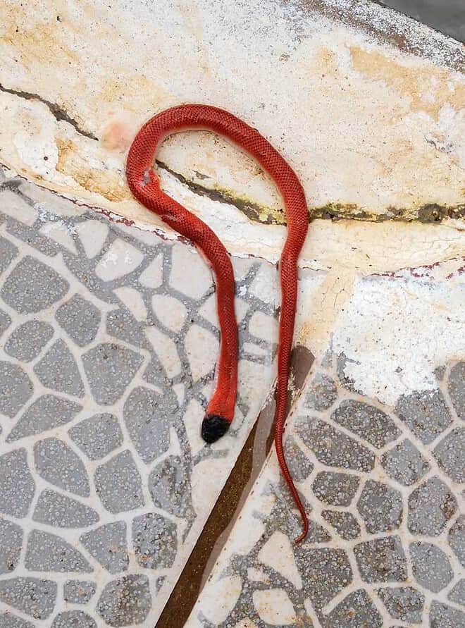 Quando tirou o sapato do pé, viu que o motivo do incômodo. A cobra seria um filhote de Cobra Coral Vermelha (Micrurus collaris), conhecida como uma das serpentes brasileiras comuns na região Norte do Brasil, principalmente na Amazônia.