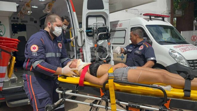 A jovem Paula Clarice Moreira Souza, de 23 anos, ficou gravemente ferida após sofrer um acidente no início da tarde deste sábado (9), no cruzamento da Avenida Ceará com a rua Santa Catarina, no bairro Habitasa, em Rio Branco.