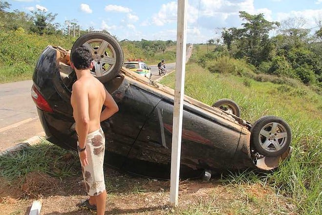 Foi quando o carro começou a fazer um ziguezague pela BR indo de encontro ao meio fio pela lateral, fazendo com que virasse pelo menos uma vez, para em seguida serem parados pelas placas de sinalização existente no local.
