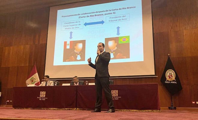 O juiz de Direito Hugo Torquato, titular da 2ª Vara Cível da Comarca de Cruzeiro do Sul, ministrou palestra sobre imigração e tráfico de pessoas na fronteira Brasil-Peru, na quinta-feira, 7, em Lima, no Peru.