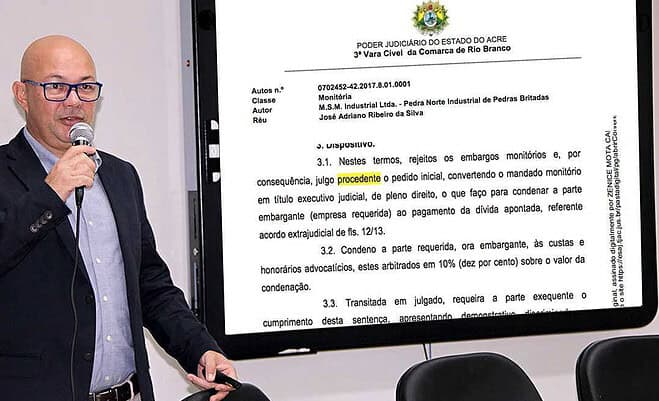 A juíza Zenice Mota Cardozo, da 3ª Vara Cível da Comarca de Rio Branco proferiu sentença em desfavor do empresário e presidente da Federação das Indústrias do Acre, José Adriano Ribeiro da Silva, pelo não cumprimento de acordo extrajudicial firmado com a empresa Pedra Norte Industrial de Pedras Britadas. O valor da dívida a ser quitada é de R$ R$ 374.238,70.