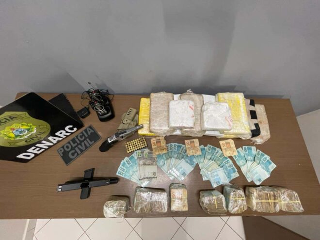 Durante a ação os agentes da Delegacia de Repressão ao Narcotráfico apreenderam onze quilos de cocaína, duas armas de fogo, sendo um pistola calibre 9 milimetros de uso restrito , dois rádios comunicadores e quase R$ 78 mil em espécie.