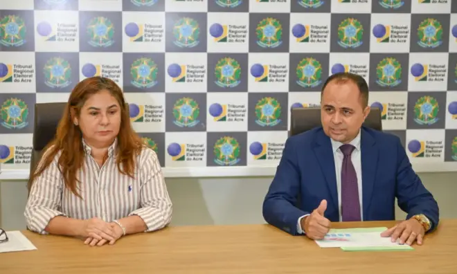 O Tribunal Regional Eleitoral do Acre (TRE-AC) realizou, na manhã desta segunda-feira (19), uma coletiva de imprensa em sua sede, com a participação do presidente da Corte, desembargador Júnior Alberto, e da vice-presidente e corregedora regional eleitoral, desembargadora Waldirene Cordeiro.