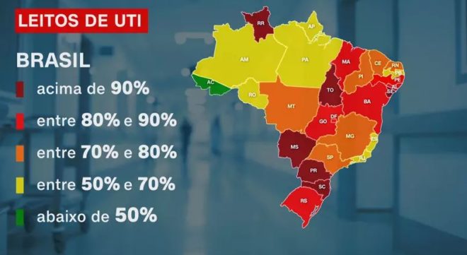 No restante do país, o cenário infelizmente não é tão animador. O levantamento feito pela agência CNN com base nos dados das secretarias de Saúde dos estados aponta que a taxa de ocupação de leitos UTI está acima de 80% em 13 estados brasileiros e no Distrito Federal.