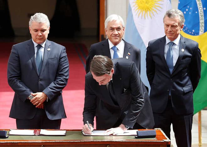 Além de Bolsonaro, assinaram o documento Mauricio Macri (Argentina), Sebastian Piñera (Chile), Mario Abdo Benítez (Paraguai), Martín Vizcarra (Peru), Iván Duque Márquez (Colômbia), Lenín Moreno (Equador) e George Talbot (embaixador da Guiana).