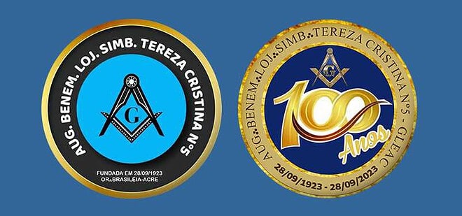 Brasão da Loja Tereza Cristina e o selo comemorativo dos 100 de fundação.