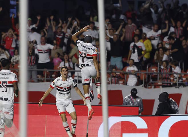 O Timão descontou em golaço de fora da área do venezuelano José Martínez, mas um minuto depois, Lucas tabelou com Calleri, costurou a defesa corintiana e bateu na saída de Hugo Souza. O goleiro Rafael voltou a aparecer bem em cabeçada de André Ramalho, muito bem defendido pelo tricolor.]