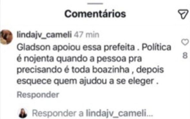 “Política é nojenta. Quando a pessoa está precisando é toda boazinha. Depois que se elege, esquece quem ajudou”, escreveu ela em comentário em uma postagem sobre o assunto, em aparente referência às mudanças de alianças entre grupos políticos do estado.