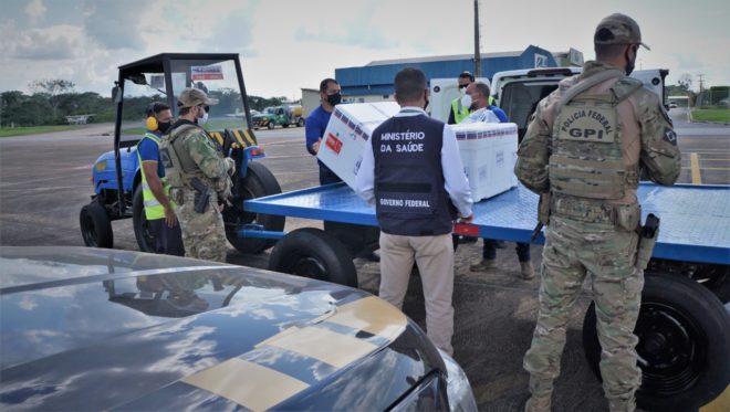 O processo de entrega aos munícipios ocorre com o auxílio das demais instituições do governo do Estado, como a Segurança Pública, para que os imunizantes cheguem de forma célere até nas localidades mais isoladas, sendo este um esforço da Secretaria de Estado de Saúde (Sesacre) por determinação do governo do Estado.