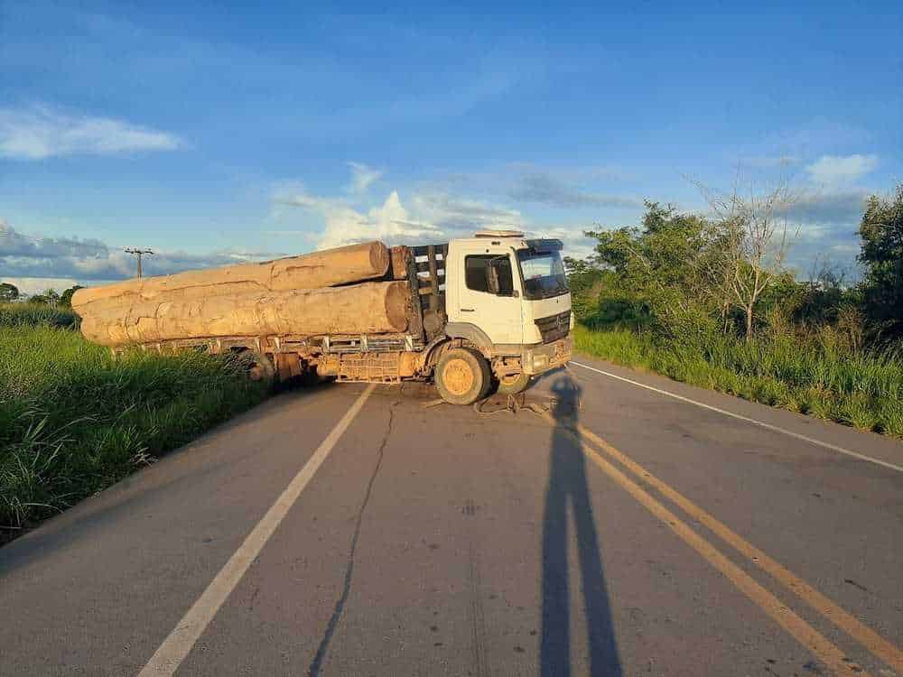 Um caminhão com carga irregular de mais de 22 metros cúbicos de madeira foi apreendido pelo Grupamento Especial de Fronteira (Gefron), nesta segunda-feira (17), em um trecho da BR-364, em Acrelândia, no interior do Acre.