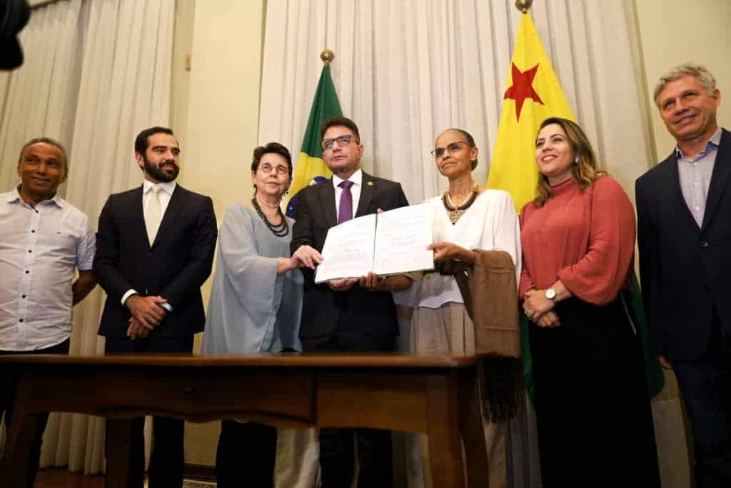 Por meio do Fundo Amazônia, o Acre recebeu R$ 98 milhões para reforçar as políticas públicas de enfrentamento aos ilícitos ambientais e fomentar a bioeconomia sustentável. A solenidade que oficializou o repasse ocorreu na sexta-feira, 12, no Palácio Rio Branco, e contou com a participação do governador Gladson Cameli, da ministra do Meio Ambiente e Mudança Clima, Marina Silva, e do ministro do Desenvolvimento Agrário e Agricultura Familiar, Paulo Teixeira.