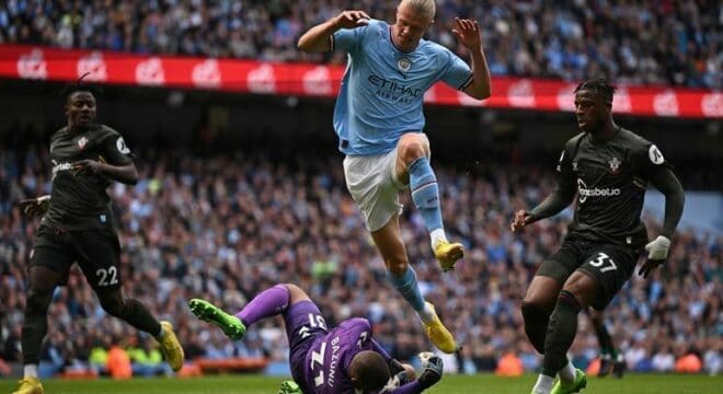 Haaland salta sobre o goleiro do Southampton em jogo que aconteceu neste sábado (8)