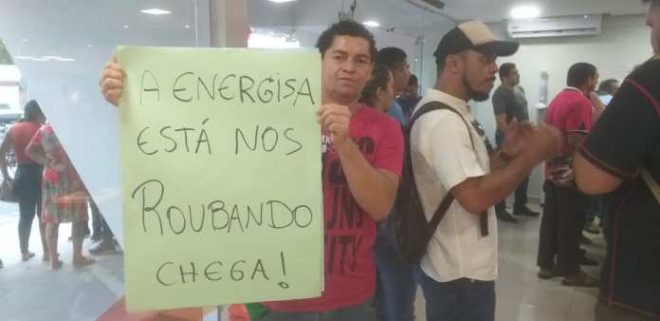 Um grupo de quase 100 pessoas conseguiram entrar no prédio da Energisa, em Rio Branco, na manhã desta quinta-feira (26) durante manifestação pacífica que cobra explicações sobre os aumentos na conta de luz dos consumidores acreanos.