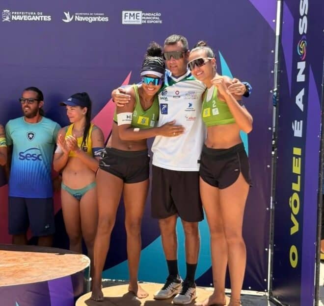 oto CBV: Manu, o técnico Giuliano Sucupira e Quemile no pódio em Navegantes
