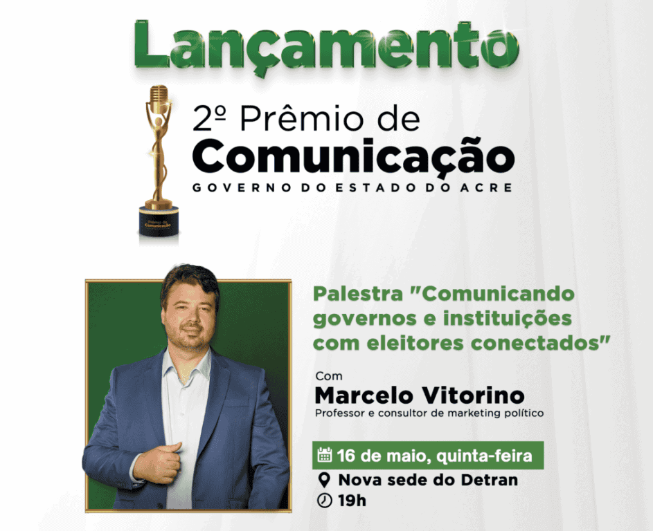 Marcelo Vitorino é palestrante, professor e consultor de marketing político. Atua no marketing por quase 20 anos, e está no marketing digital desde 2006. Foi um dos primeiros profissionais da comunicação tradicional a migrar para o meio online e para as novas plataformas. Os interessados em participar da palestra devem fazer o credenciamento até o dia 15 de maio no link: https://www.even3.com.br/palestra-comunicando-governos-e-instituicoes-com-eleitores-conectados-458654/.