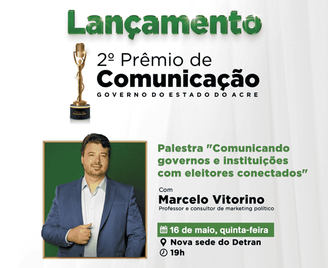 Marcelo Vitorino é palestrante, professor e consultor de marketing político. Atua no marketing por quase 20 anos, e está no marketing digital desde 2006. Foi um dos primeiros profissionais da comunicação tradicional a migrar para o meio online e para as novas plataformas. Os interessados em participar da palestra devem fazer o credenciamento até o dia 15 de maio no link: https://www.even3.com.br/palestra-comunicando-governos-e-instituicoes-com-eleitores-conectados-458654/.