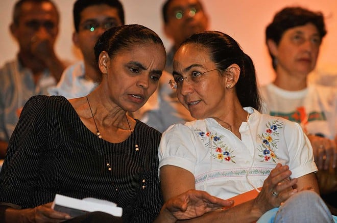 Brasília – As ex-senadoras Marina Silva e Heloísa Helena conversam na solenidade de lançamento de novo partido – José Cruz/ABr