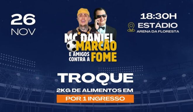 O Acre será palco de um evento beneficente inédito nesta terça-feira (26), às 19h, na Arena da Floresta, em Rio Branco. A primeira edição do “MC Daniel, Marcão e Amigos Contra a Fome” reunirá artistas, influenciadores e ex-atletas de renome nacional, com o objetivo de arrecadar alimentos para famílias em situação de vulnerabilidade.