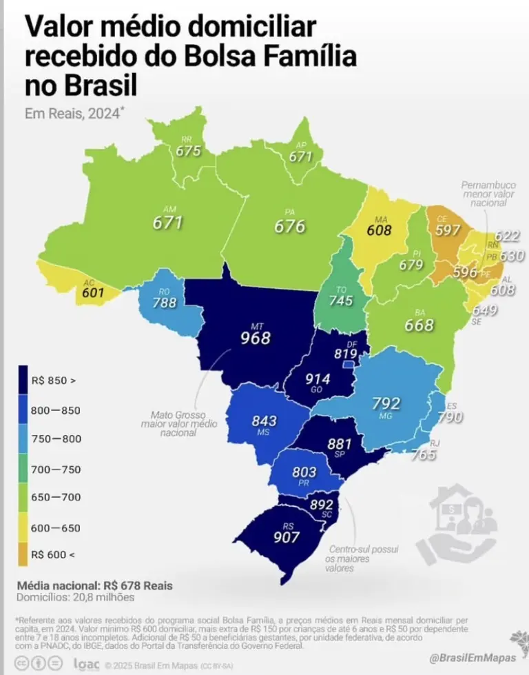 Os dados reunidos pelo Brasil em Mapas mostram um panorama nacional das desigualdades na distribuição dos valores do Bolsa Família. Enquanto estados do Centro-Oeste e do Sul lideram com os maiores valores médios, estados das regiões Norte e Nordeste apresentam os menores índices.