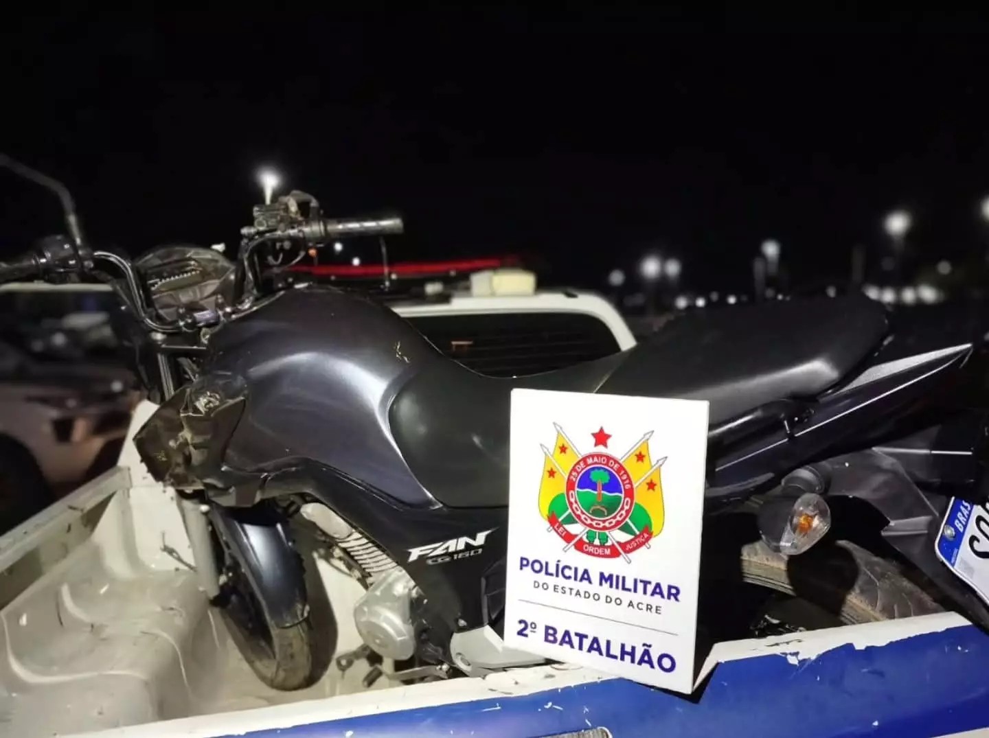 Uma motocicleta com registro de furto/roubo foi recuperada pela Polícia Militar na tarde deste sábado (03), no bairro Triângulo, região do Segundo Distrito de Rio Branco.