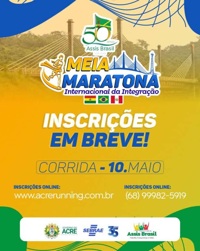 A Prefeitura de Assis Brasil anunciou a realização da Meia Maratona Internacional da Integração, que acontecerá no dia 10 de maio, como parte da programação especial em comemoração aos 50 anos de emancipação política do município.