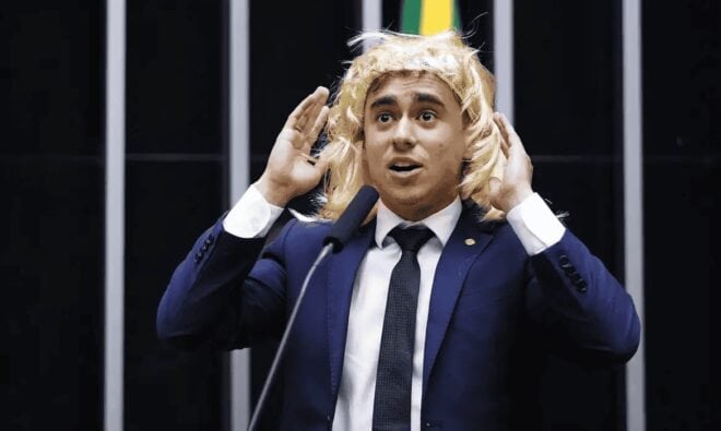 Em seu discurso, Nikolas Ferreira afirmou que as ‘mulheres estão perdendo espaço para homens que se sentem mulheres’. Também vestiu uma peruca e ironizou: “Hoje me sinto mulher, deputada Nicole.”
