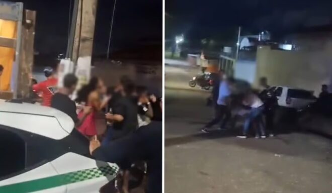 Nas imagens que circulam nas redes sociais, é possível ver parte do grupo discutindo e partindo para agressões em plena via pública, enquanto outras pessoas tentam intervir para conter a briga. A confusão chamou a atenção de moradores da região e de quem passava pelo local no início da manhã.