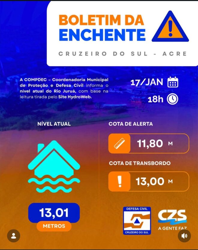 O Rio Juruá ultrapassou a marca de transbordamento em Cruzeiro do Sul, no interior do Acre, atingindo 13,01 metros na medição das 18h deste sábado (17) – acima da cota crítica de 13 metros. Diante do cenário, a Prefeitura municipal declarou situação de atenção redobrada e acionou o Plano de Contingência para áreas ribeirinhas.