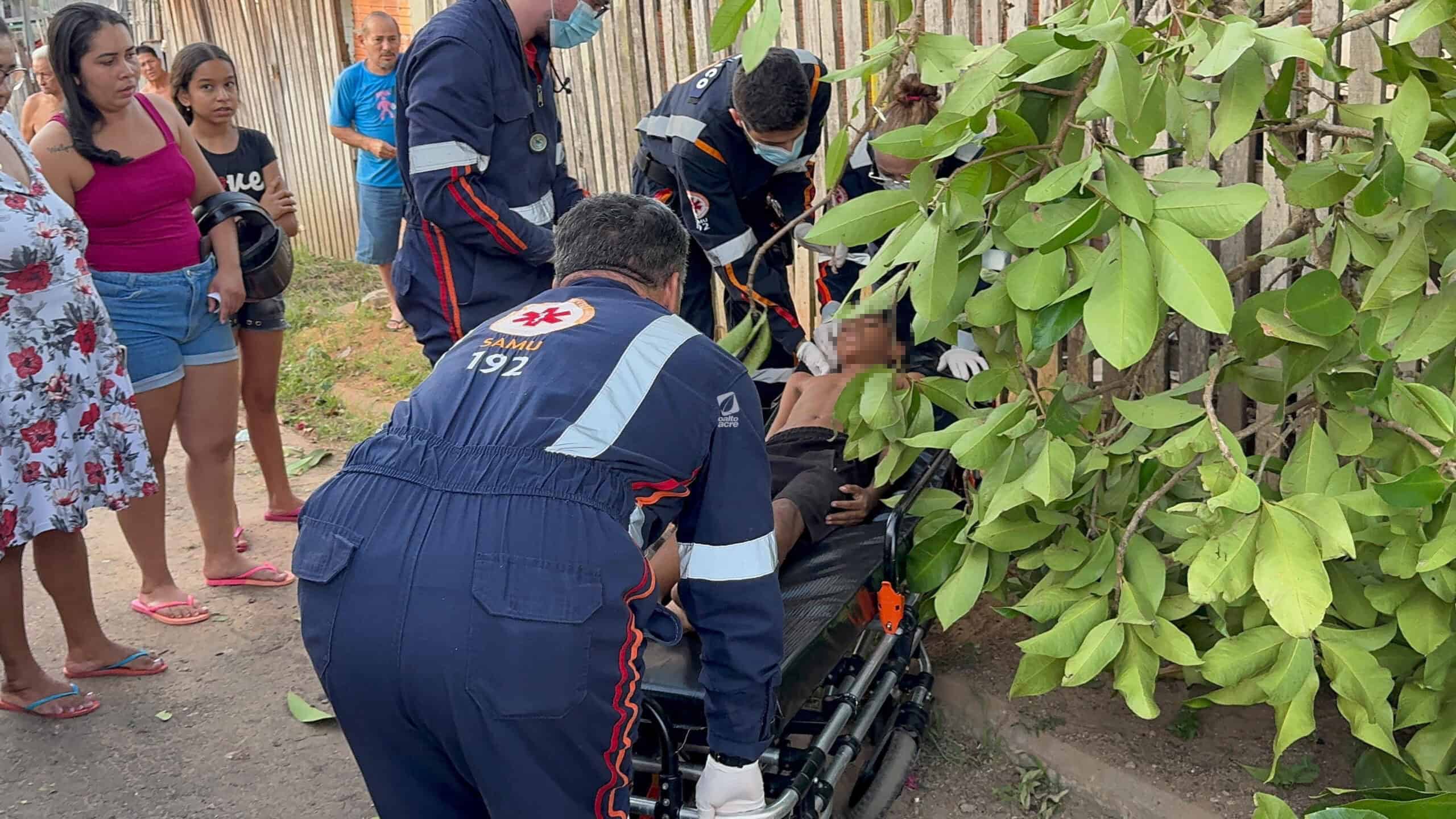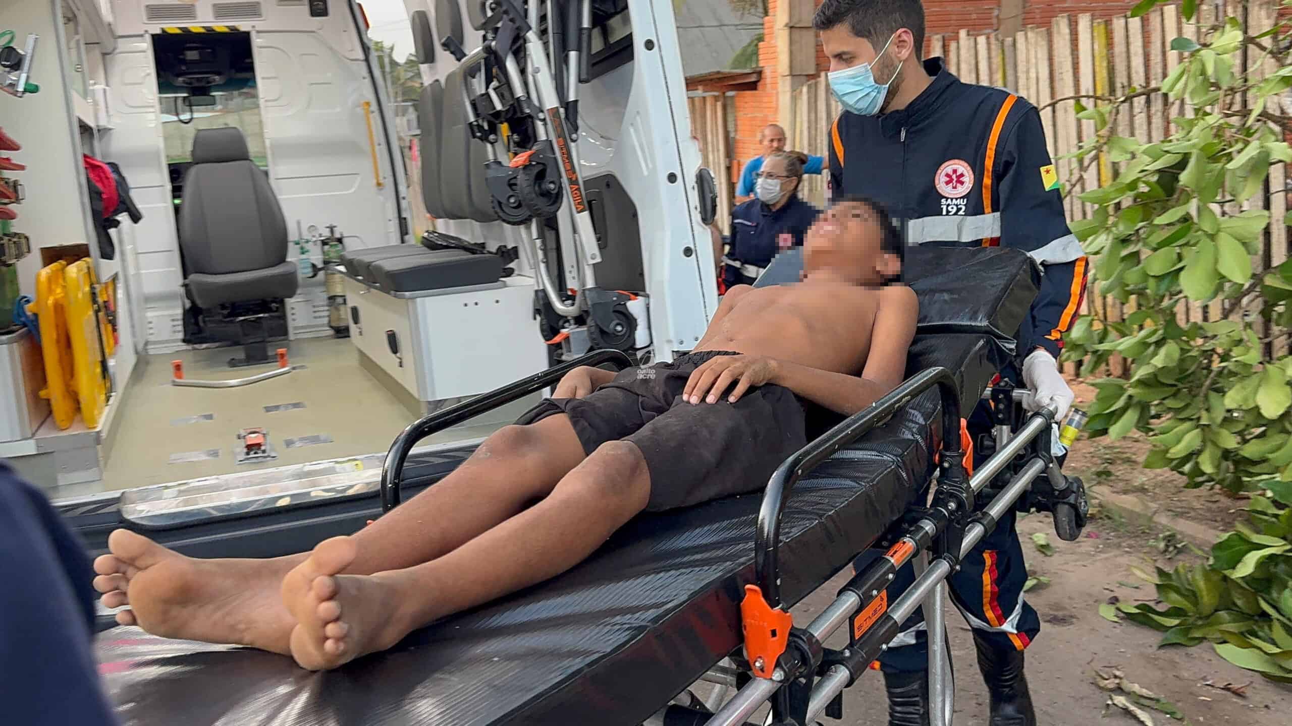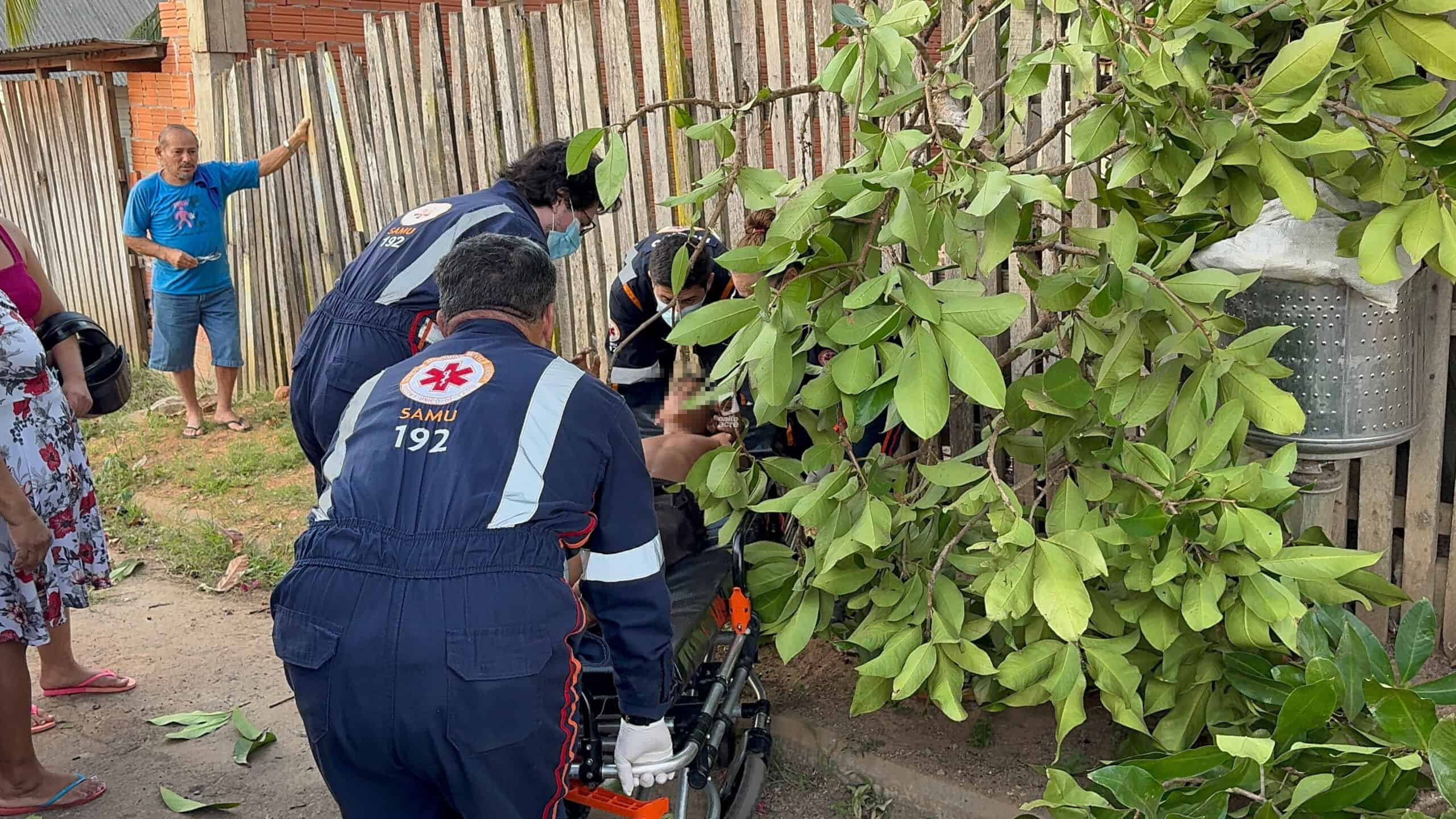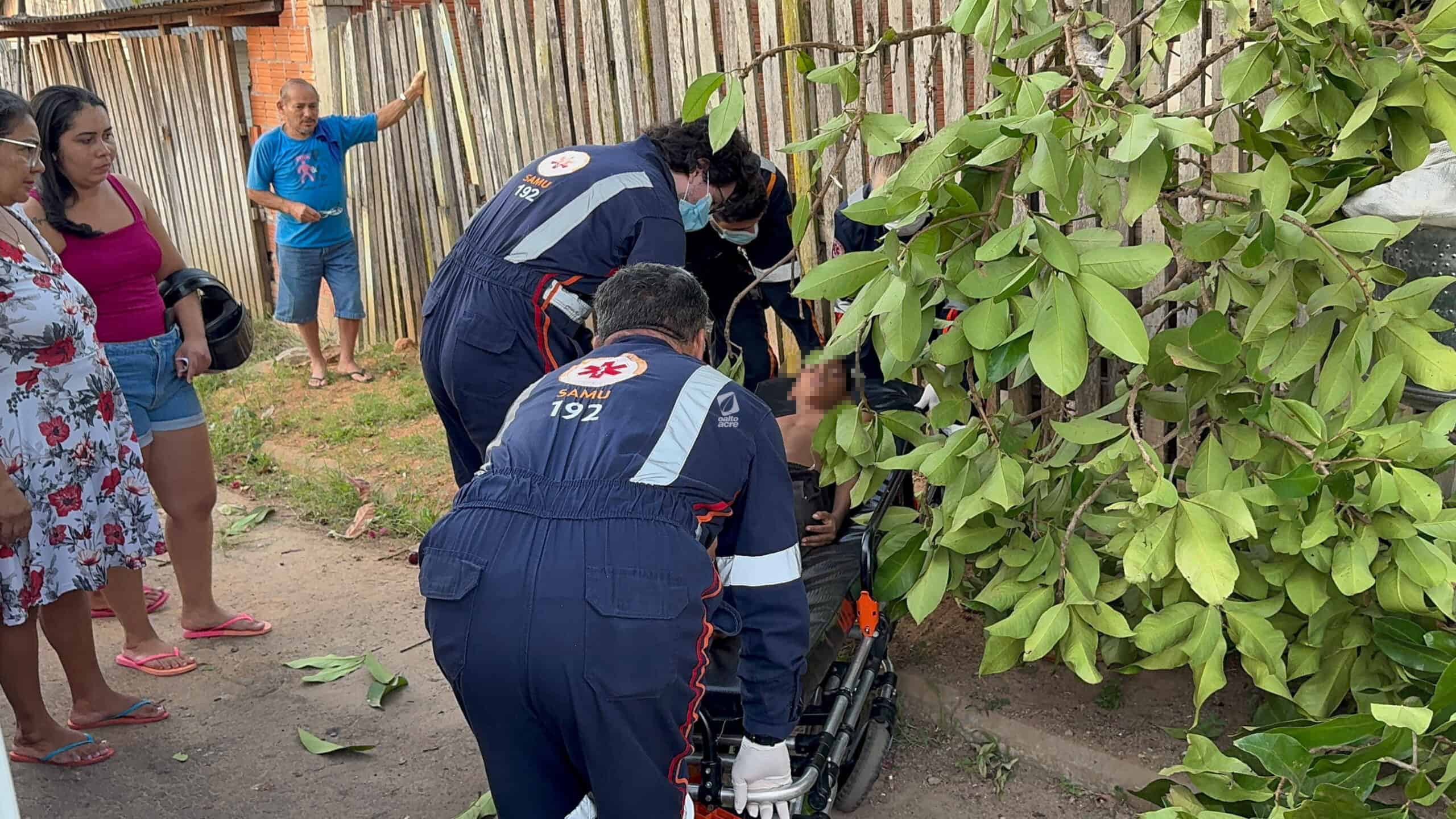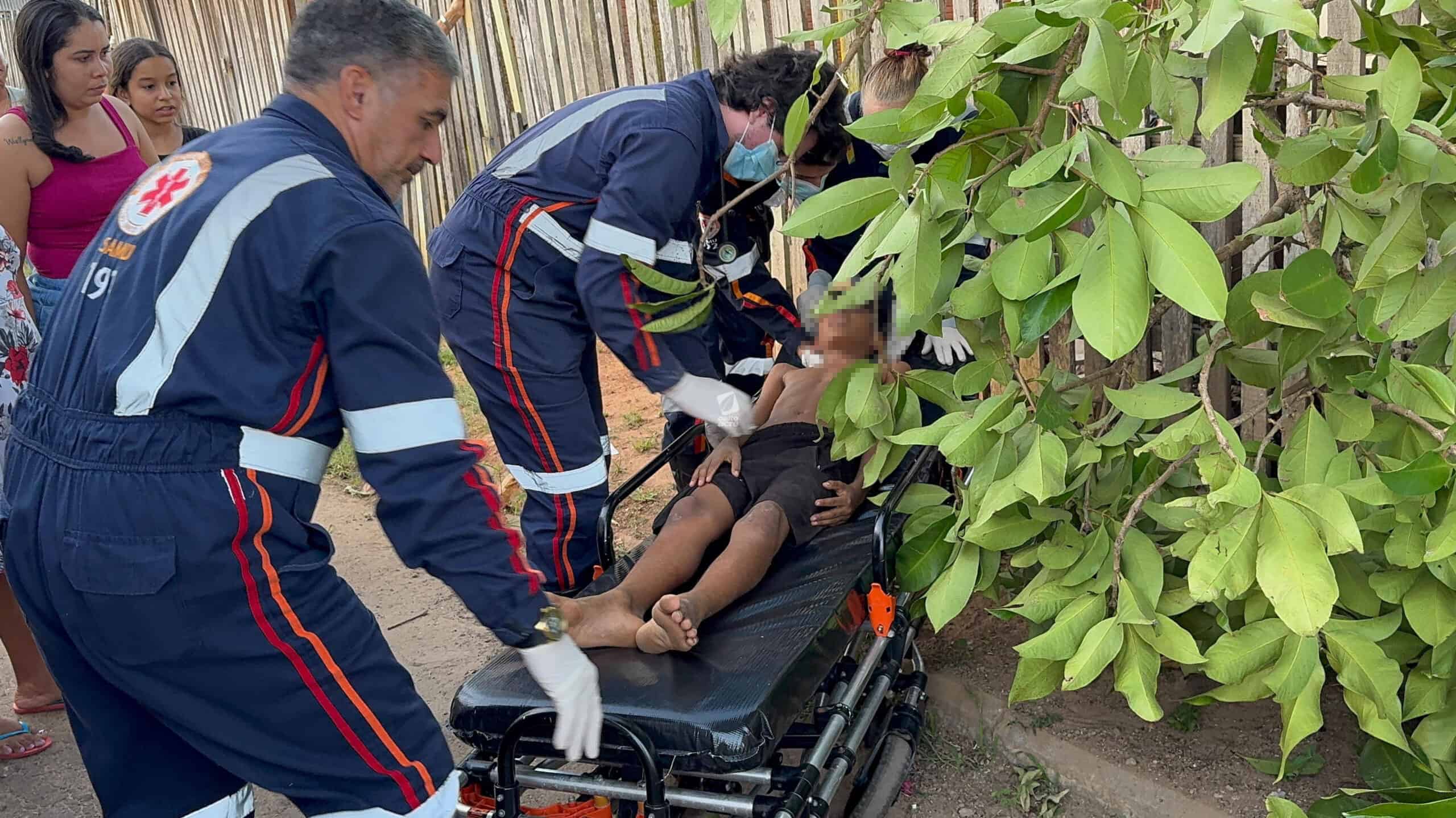 Um menino de 11 anos ficou ferido no final da tarde desta quinta-feira (14) após cair de uma árvore no quintal de sua casa, localizada na Travessa Benjamin, bairro Tancredo Neves, região do Montanhês, em Rio Branco. Ele tentava colher jambo quando um dos galhos se rompeu, provocando a queda.