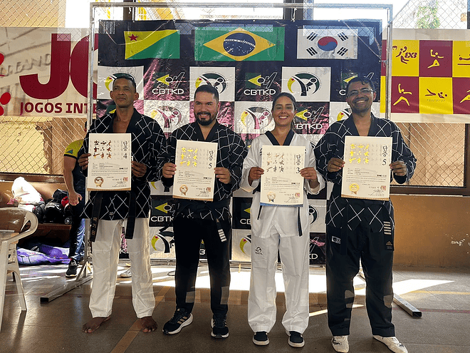 A delegação da Federação de Taekwondo do Estado do Acre (FETEAC) participou do Kukkiwon Special Dam Promotion Test in Brasil. O evento foi realizado no Rio de Janeiro entre os dias 23 a 25 de fevereiro de 2024 e contou com a participação de mais de 400 faixas pretas vindos de várias partes do país. No entanto, somente agora os novos mestres acreanos receberam suas certificações devido as exigências e normas extremamente criteriosas estabelecidas pela entidade coreana. Os mestres acreanos que receberam suas certificações de mestrado em taekwondo pela Kukkiwon foram: Tiago Marques (Mestre 5º Dan), Jocirley Braga (Mestre 5º Dan), Leddinho Souza (Mestre 5º Dan), Amâncio Oliveira (Mestre 4º Dan) e Aldeniza dos Santos (Professora 3º Dan). A entrega dos certificados aconteceu dia 03 de agosto (sábado) durante as programações dos Jogos Escolares realizado na quadra do Colégio Acreano.