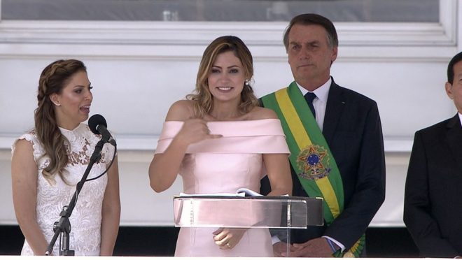 A primeira-dama, Michelle Bolsonaro, quebrou protocolo e fez discurso em Libras (Língua Brasileira de Sinais), no parlatório do Palácio do Planalto durante solenidade de posse do marido, Jair Bolsonaro, na Presidência da República.